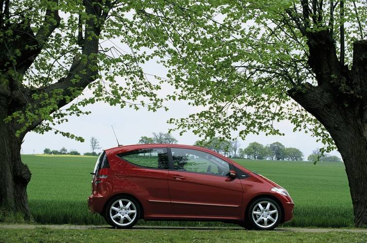 A Mercedes-Benz A está disponível em dois estilos de carroceria - hatchback de três portas e hatchback de cinco portas. O carro foi fabricado pela primeira vez na Alemanha em 2004 e oferece motores a gasolina e diesel com uma potência máxima de 142 kW (A 200 Turbo). O modelo mais rápido, o A 200 Turbo, tem uma velocidade máxima de 228 km/h e aceleração mais lenta de 0-100 km/h em 7,5 segundos. O motor mais econômico em combustível, o A 180 CDI, tem um consumo de combustível de 5,2 l/100 km e emissões de 137 g/km. A bagageira do carro tem uma capacidade de 435 litros para ambos os tipos de carroceria. Os testes de segurança EURONCAP terminaram com uma classificação de 5 de 5.